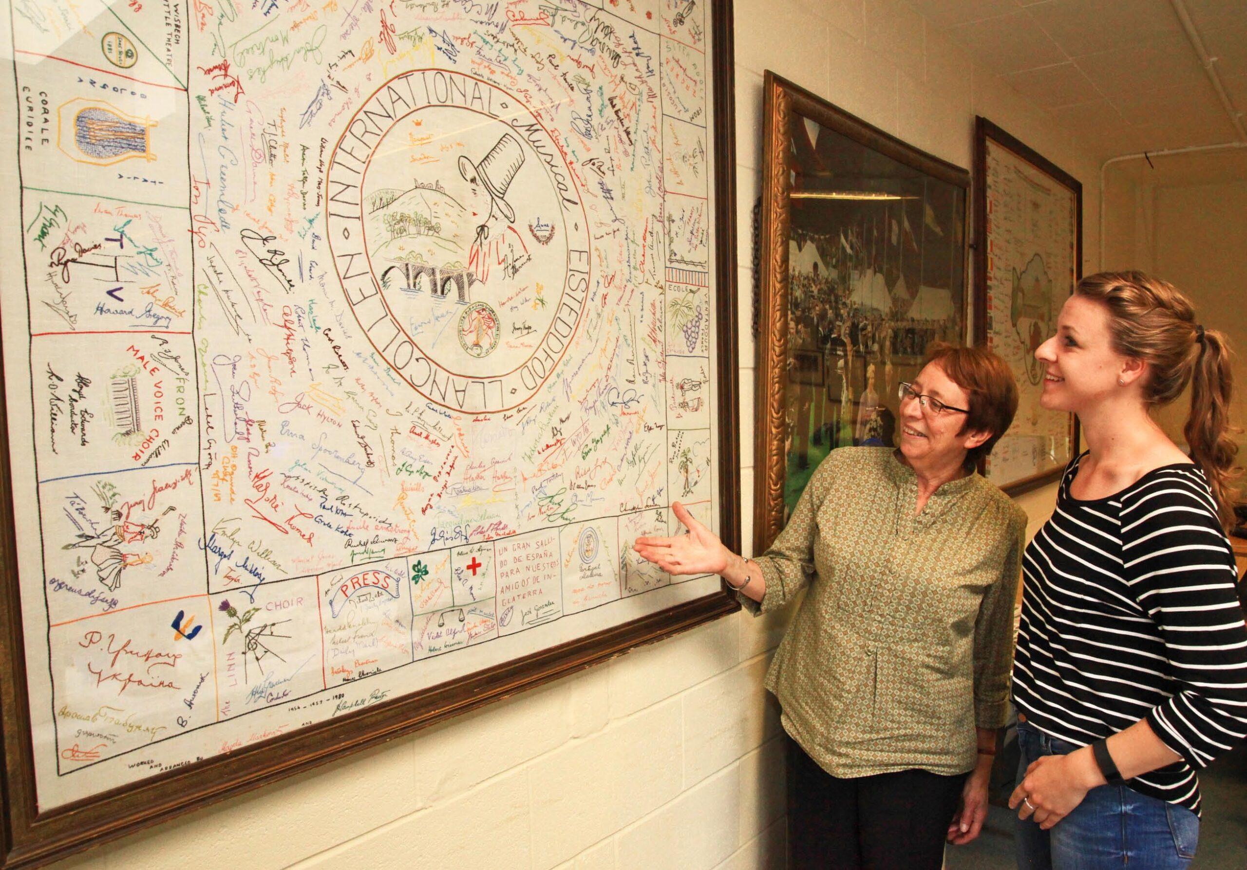 Mae’r lliain bwrdd sydd wedi ei fframio wedi ei haddurno â channoedd o lofnodion gan gyn ymwelwyr a chystadleuwyr i’r Eisteddfod. Mae’r lliain yn Swyddfa’r Wasg yr Ŵyl ar hyn o bryd ond mae Darina Gaffin o Froncysyllte, a oedd yn athrawes iaith cyn iddi ymddeol ac sydd wedi gwirfoddoli ei hun fel un o Dîm Blodau’r Eisteddfod, eisiau gweld gwaith ei mam yn cael ei arddangos yn gyhoeddus.